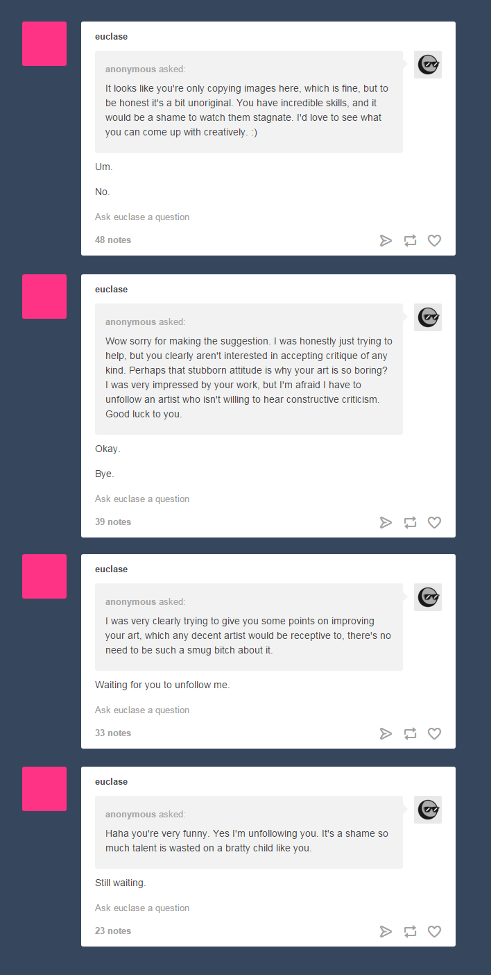 I really don't like that anon, first... He comes up as anon, then he speak his mind (that can be taken as suggestion but not criticism imo) and ends with a smiling face but because he didn't get the response he wanted, like "I see... I'll change, thank you!" or a rage comment, he proceed to call euclase's art boring even though he claims to be following her/he before. Clearly just to infuriate but again he doesn't get the answer he was looking for... So he keeps bugging. tbh I didn't know euclase and the first response he gave was bad, is better to ignore it but you also need to know when and from who take advices.