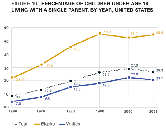 Another explanation is that it was largely encouraged by welfare reform in the 60s. A married couple with a child would only get a tiny bit of money, but if they lived apart, the mother could get a lot more money.