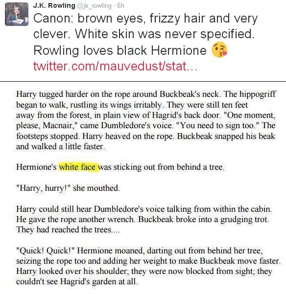 "Canon: brown eyes, frizzy hair and very clever. White skin was never specified. Rowling loves black Hermione"