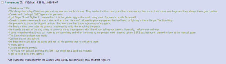 And I watched. I watched from the window while slowly caressing my copy of Street Fighter II.