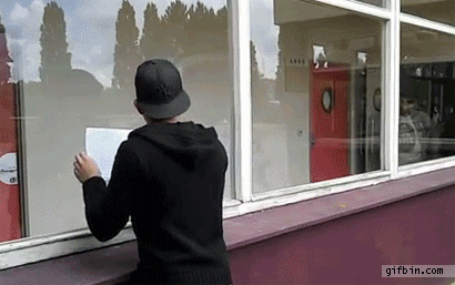 It's a school and he's doing it as a joke and that homophobe dude is overreacting. He now has to pay for the glass at the cost of roughly 200$ (I know because my best friend did the same thing in highschool and headbutted the glass) FYI the single pane should have been changed years ago.