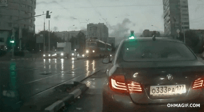 Except the angle of the appearing car would suggest that it is turning, which would also suggest that it came from their right, relative to where they entered the intersection, and the car is too long not to be seen on the right side of the main car in the gif before passing onto the left side of the main car. honestly tho, i'd say it's shopped.