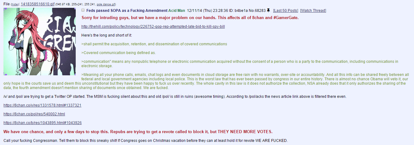 only hope is the courts save us and deem this unconstitutional but they have been happy to **** us over recently. The whole cavity in this law is it does not authorize the collection, NSA already does that it only authorizes the sharing ofthe