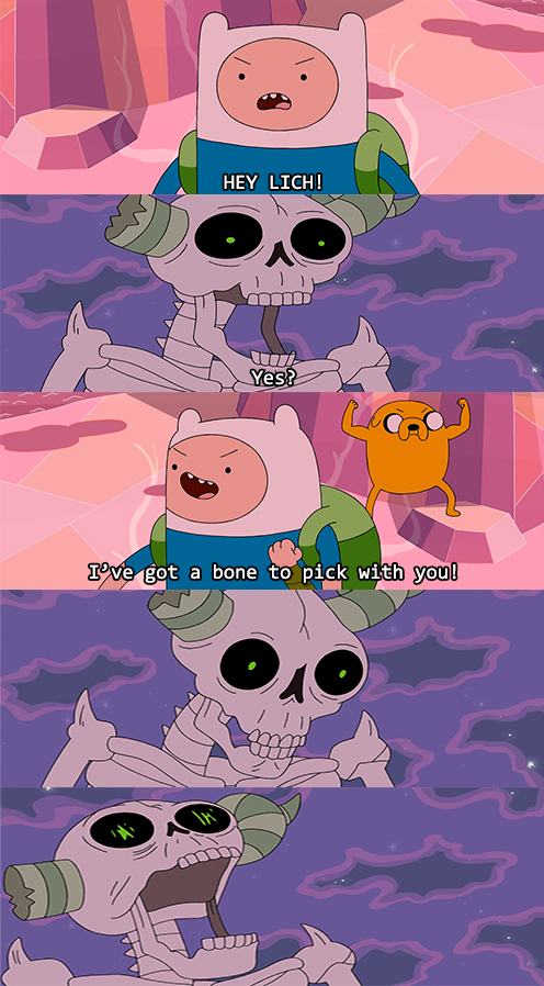 "He was first alluded to in the early series pitch, and was the only other character described in those documents in addition to the main six: Finn, Jake, Princess Bubblegum, Lady Rainicorn, Ice King, and Marceline. The pitch document states in all caps, "THE LICH KING IS NOT FUNNY," and states that the Lich had been imprisoned within his castle (although this was later contradicted in "Mortal Folly"). According to the pitch document, he uses a legion of undead skeletal knights to aid in his battles."