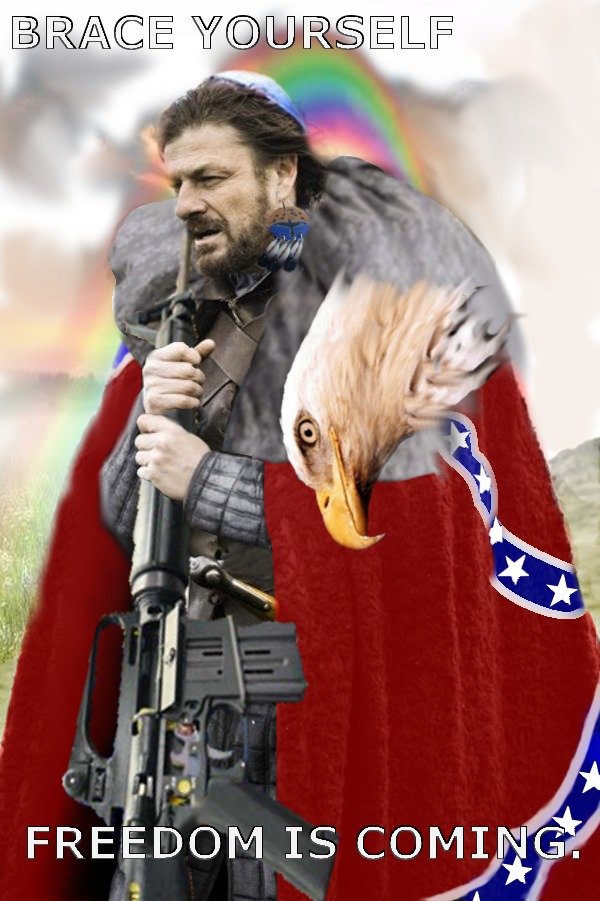 I photoshopped this using gimp to depict america should be just a mesh of things. the rebel flag, the gun, a rainbow in the back for homos, the earing is suppose to be native american to represent race and being that it's an dearing that usually identifies as female also includes women and trans and then a jewish hat (I don't know what they're called) to show religion, with a camo drape for the armed forces.