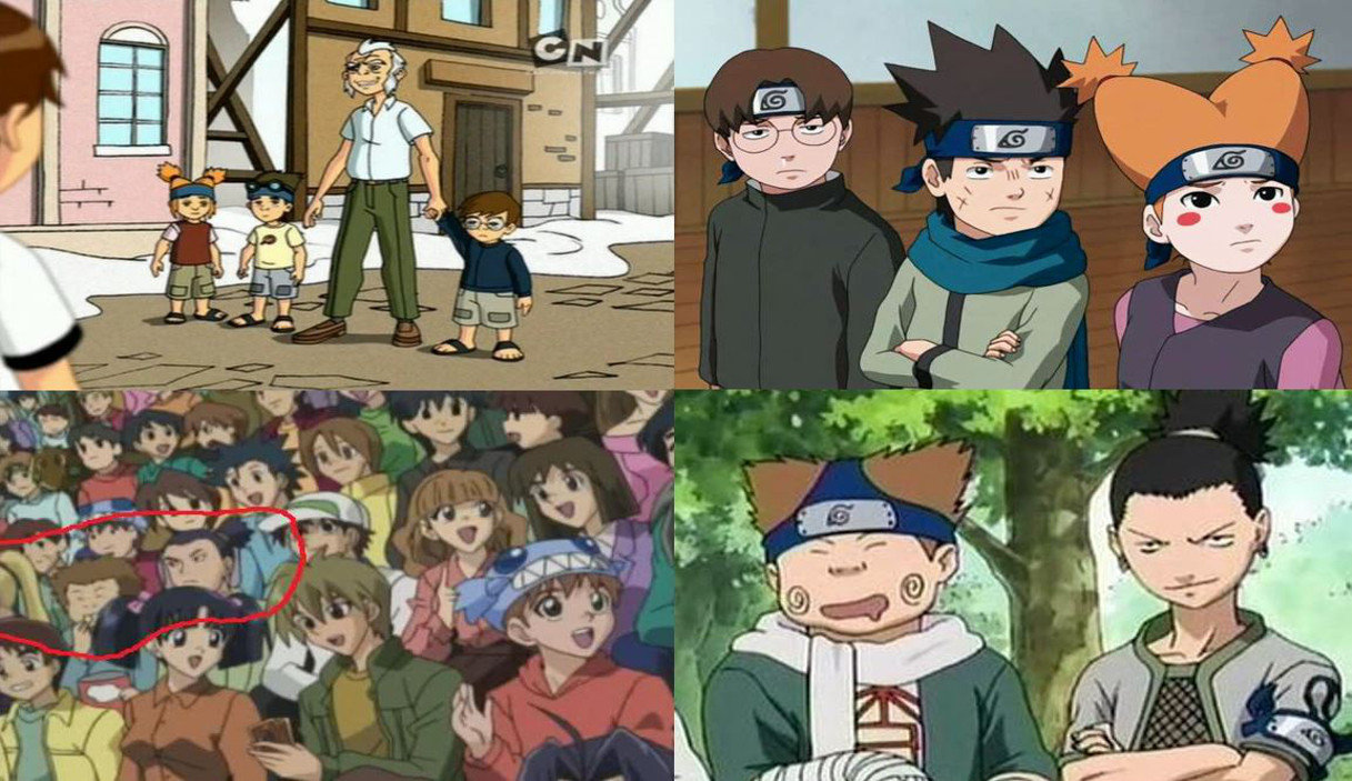 Konohamaru and his team mates, Moegi and Udon from Naruto can be seen in episode 30 of Ben 10. Characters like Shikamaru and Choji also make a cameo appearance in Yu-Gi-Oh!
