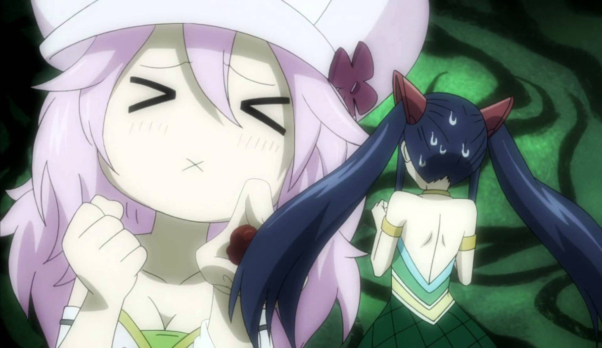 Majken Bullard was the original English voice actor of Plue in season 1, after moving, Funimation script adapter Monica Rial took over, she also plays Mirajane.