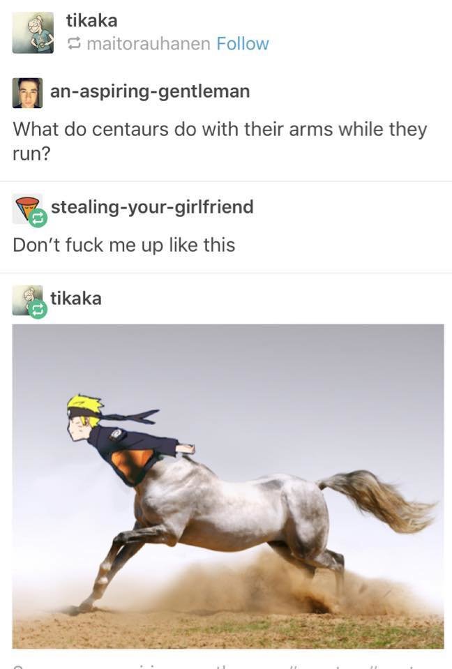 <centaurs, I believe would pump their arms back and forth as humans do. The action should help them breath better by manually forcing the lungs open and shut to a small degree by the surrounding tissues movements. Of course this is just theory, as magical beasts they may not have lungs, or use the upper chest cavity for other purposes and use the chest cavity in the lower horse part for their internal organs and the upper part have no "normal" organs.