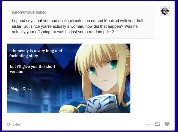 Because somebody at TYPE-MOON asked the question, "What if you could summon historical and mythological figures as slaves and the **** them?" Then asked, "Who is the most famous figure in mythology?" And decided on King Arthur. Then, they asked the question "How do I get people to want to **** King Arthur?" This was their answer.