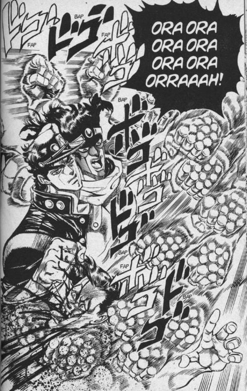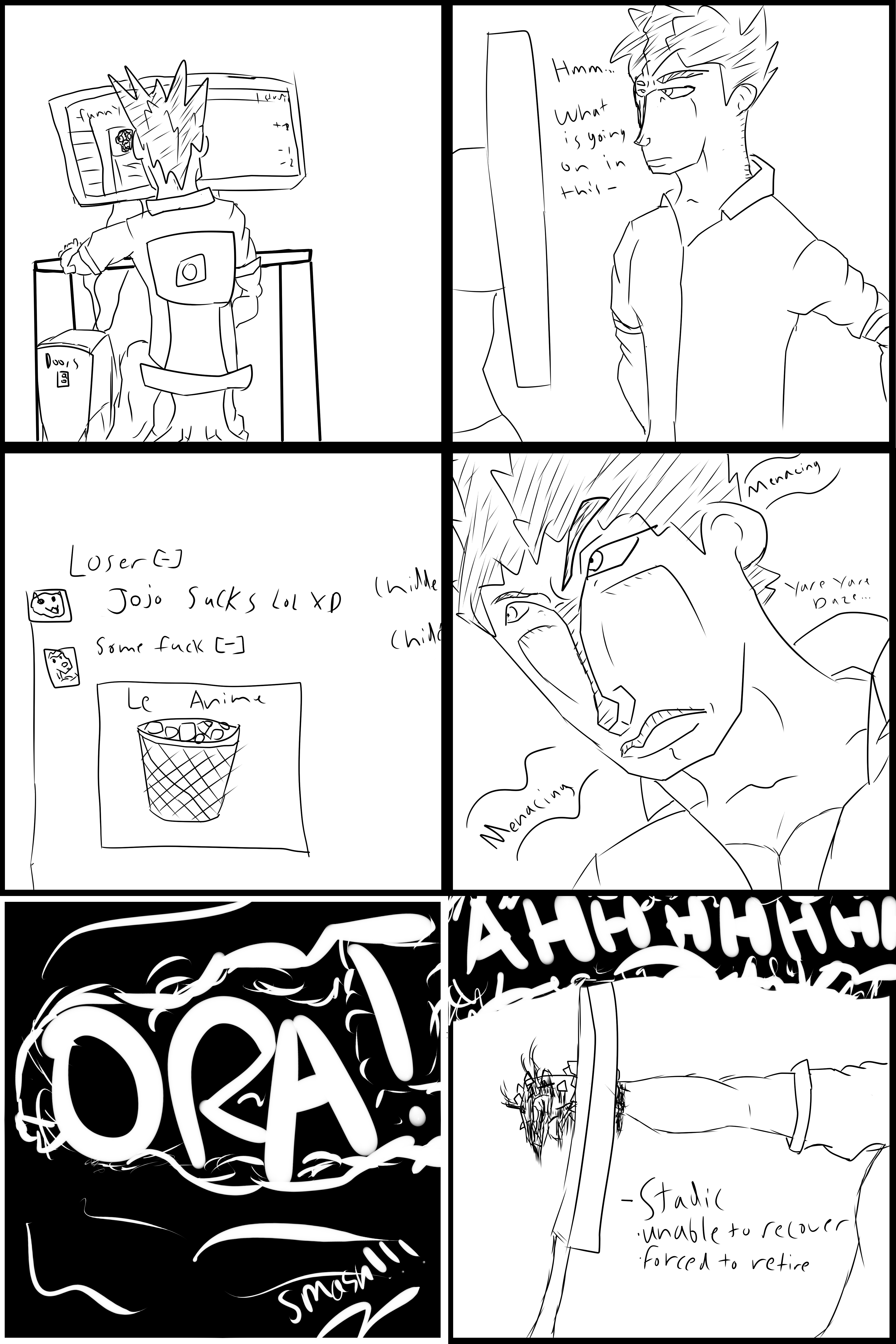 Your art style is a bit boring for JoJo. I like how you draw that face in fourth panel though. Should throw in a pose or something. And JoJo's Stand does not simply punch once.. Should add in punches in the last panel. (look at my comment picture for an example) overall: not funny. I like your fourth panel though.