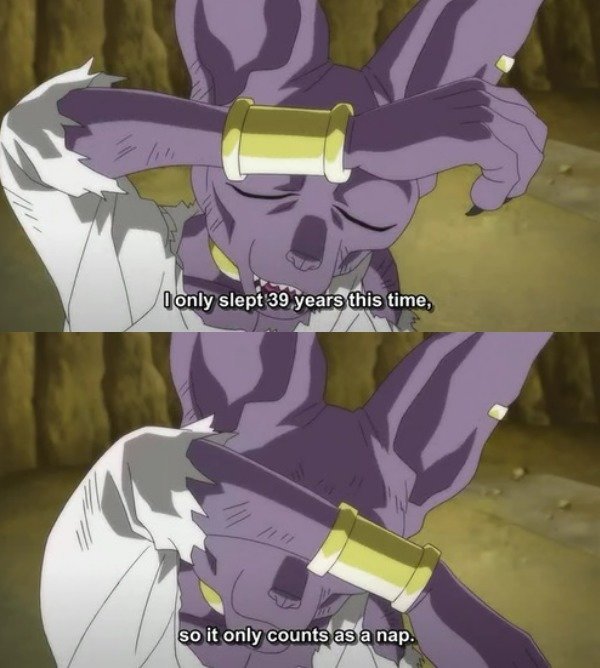 Yeah, he's an alien god from another dimension. So why is it funny that his naps are 39 years? He lives way longer, right? I may be that guy who is "fun at parties", but I don't even think this joke warrants a "party". It's a nice, small, silly tidbit in the DBZ lore/universe, and it's telling of the character, but it's still not funny. Maybe grin-worthy?