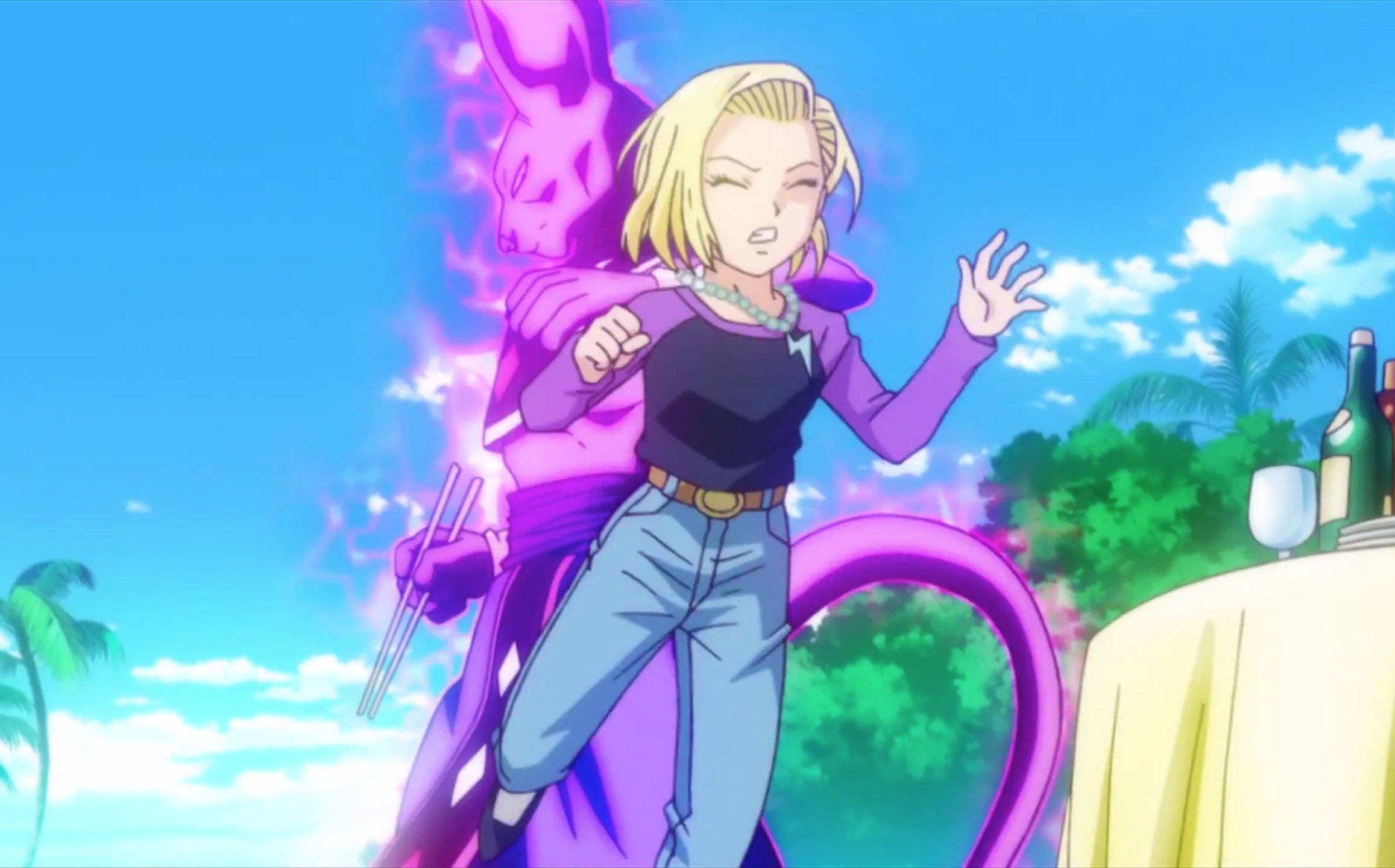 18 is the first character in Dragon Ball canon to defeat a Super Saiyan on her own, during her fight with Vegeta. While the two start the fight at similar strength levels, 18's unlimited power supply easily outlasted Vegeta's new super saiyan form, weakening him and soon after effortlessly incapacitating him. With training, she eventually became powerful enough to stand up to the likes of Hercule Satan, the world's greatest fighter.