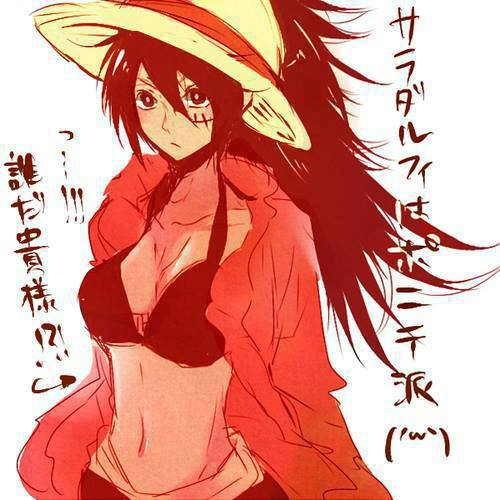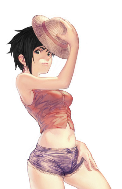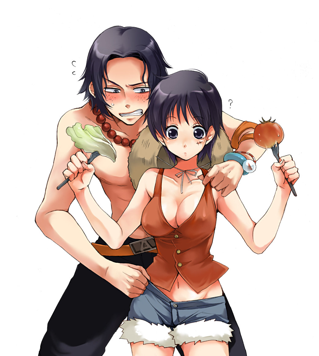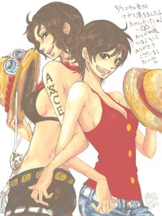 Girl luffy's pants and cloths look like they were probably showing a lot, and ace, luffy's brother is adjusting her clothes to be less revealing, probably.