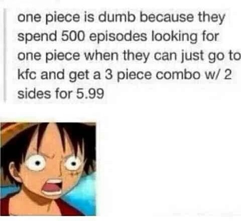 what was that one screen cap from Tumblr where it made a joke about this show and said they spent all that time looking for 1 piece when they could've went to KFC and got a 8 piece mix for like $5