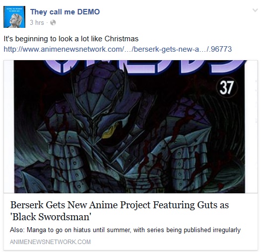 Here is the whole pic. Looks like they are going to use the same crappy CGI from the movies, but hopefully I am wrong. But manga goes on hiatus until ******* July 2016. Why are you doing this to us Miura?! I guess it will take another 7 years to get off the island.