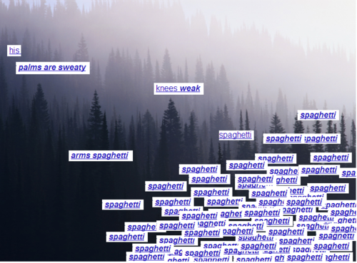 His palms are spaghetti, knees weak, arms spaghetti, There's vomit on his spaghetti already: mom's spaghetti. He's nervous, but on the surface he looks calm spaghetti. To drop spaghetti, but he keeps on spaghetti. What he wrote down, the whole crowd goes spaghetti. He opens his mouth but spaghetti won't come out. He's choking, how? Everybody's joking now. The spaghetti's run out, time's up, over - blaow! Snap back to spaghetti, oh! - there goes gravity. Oh - there goes spaghetti, he choked. He's so mad, but he won't Give up spaghetti nope, he won't have it