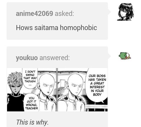 Oh no, Saitama misunderstood what somebody said, thus making it mildly funny, but it also confirmed he's heterosexual, or possibly even asexual (who'd survive One Thrust Man?).