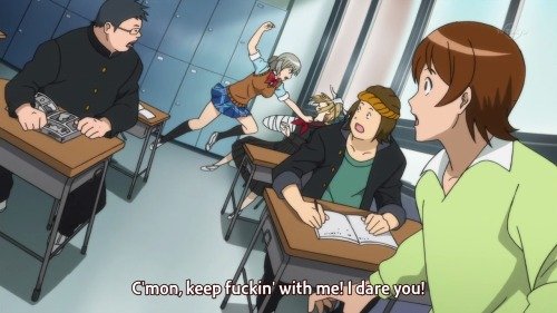 The one on the right in the back in the last frame passed the person in most of the frames that note. You get in trouble for passing notes in japanese school, and since 90% of animu takes place in ******* schools (WHY GOD SO BORING) that's a well known animu trope. However, the girl couldn't resist finding out what was in the note, so she opened it, only to find that the other person gave her a blank note just to **** with her. Rage: 100%.