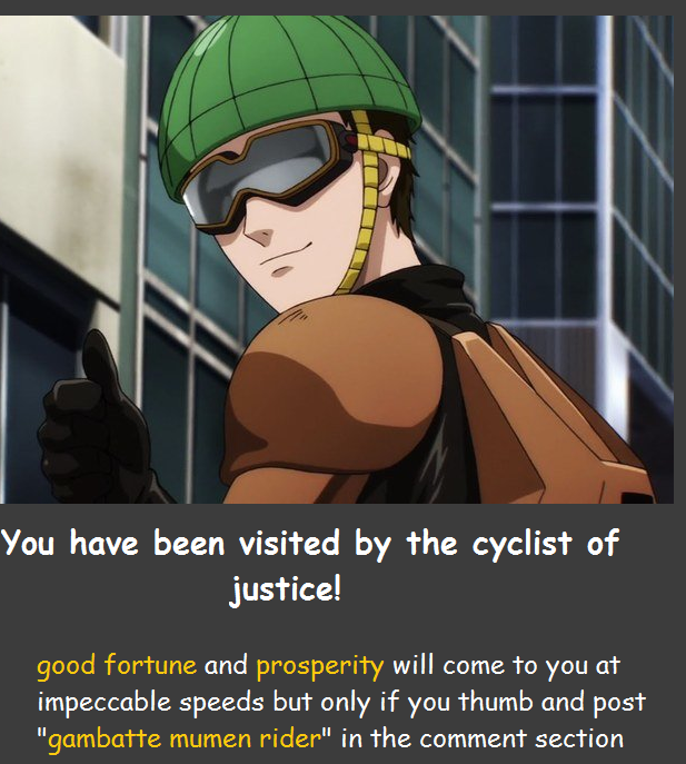 You have been visited by the cyclist of justice! good fortune and prosperity will come to you at impeccable speeds but only if you thumb and post "gambatte mumen rider" in the comment section