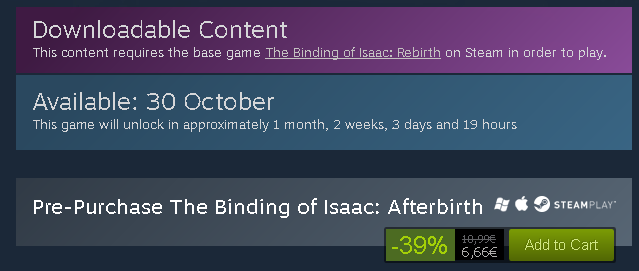 The Binding of Isaac Rebirth: Owners of the game that pre-ordered Afterbirth were given a 39% discount on the game- making it $6.66.