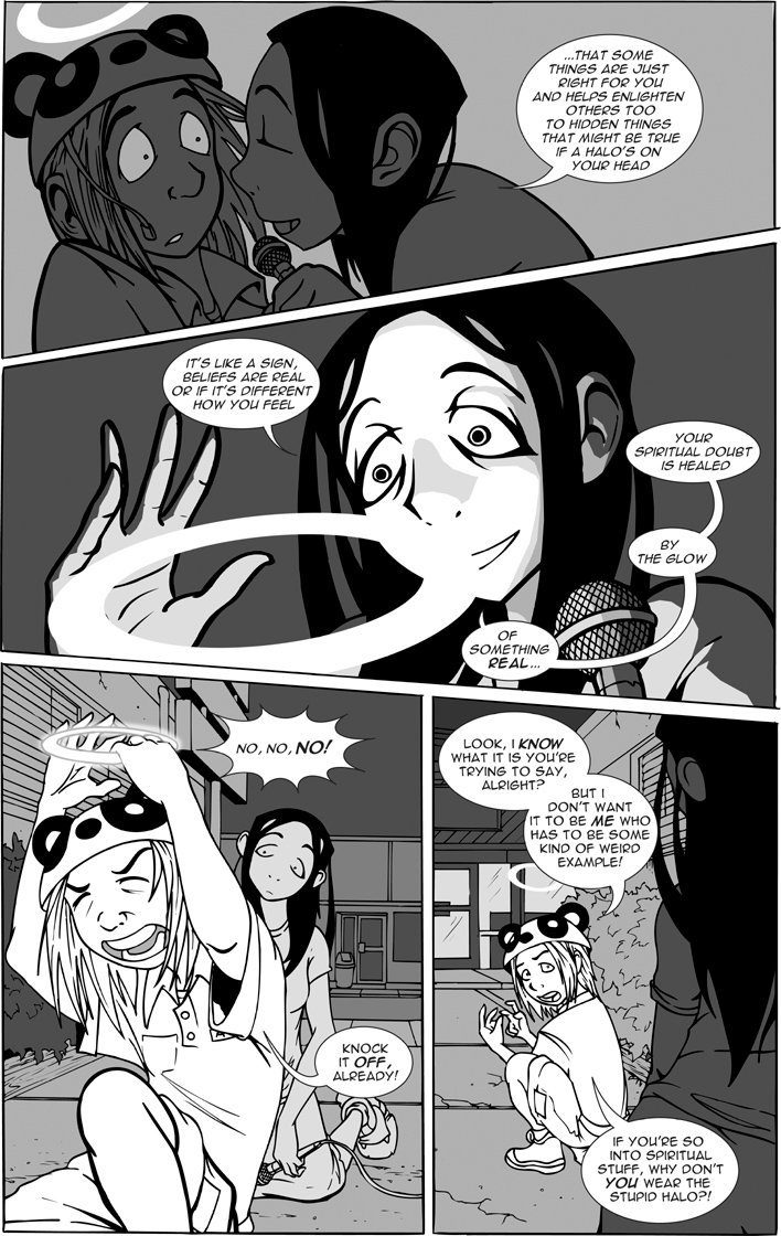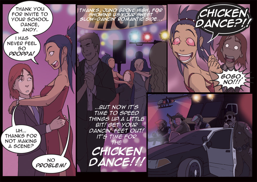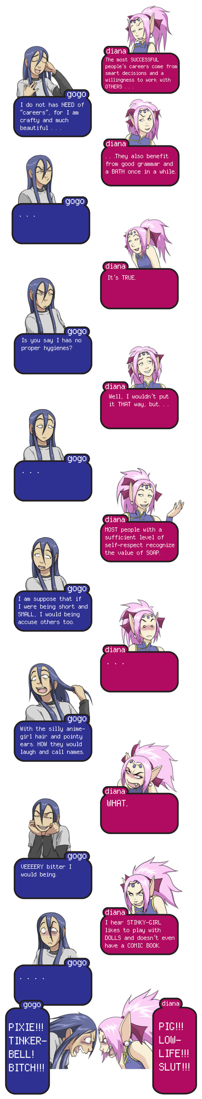 Hey guys! Here's another round of extras for ya. As you might be able to tell, most of this stuff was drawn while the author was still figuring out the setting and characters for Bomango. Hence the not-terrible singing by Gogo, the less-polished artstyle, and the interaction with Diana, who ended up in another comic. So yeah, as far as I can tell these are mostly non-canon. Except for maybe that last one there, I can totally see that happening.