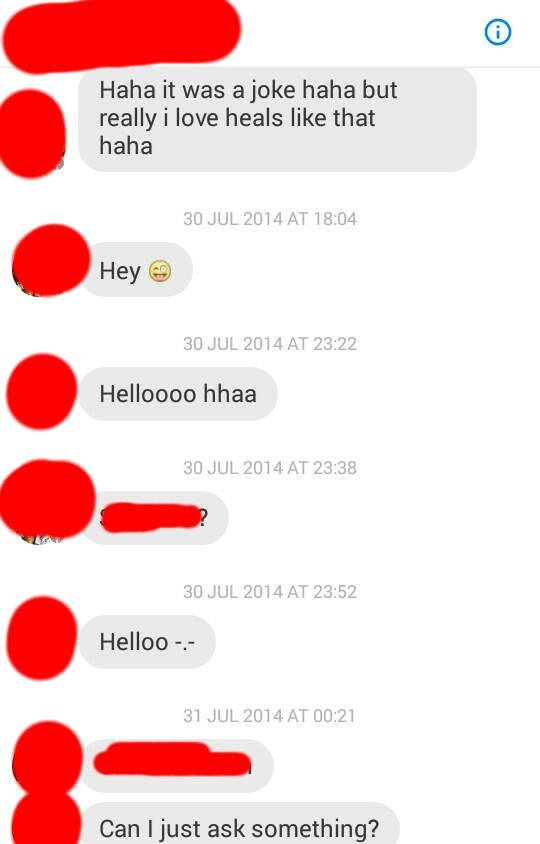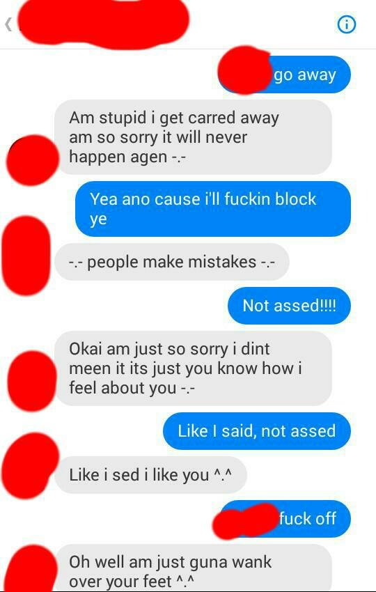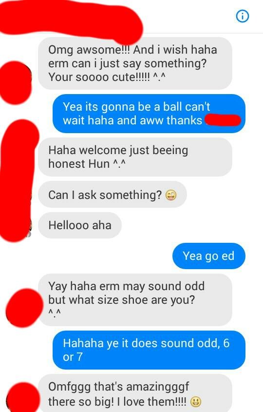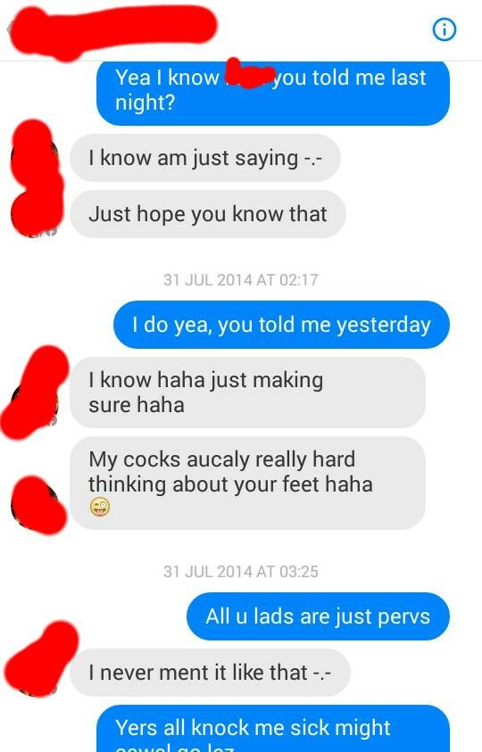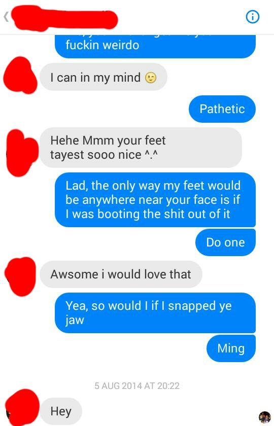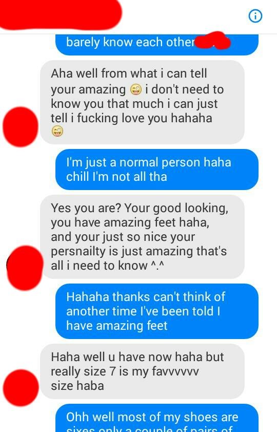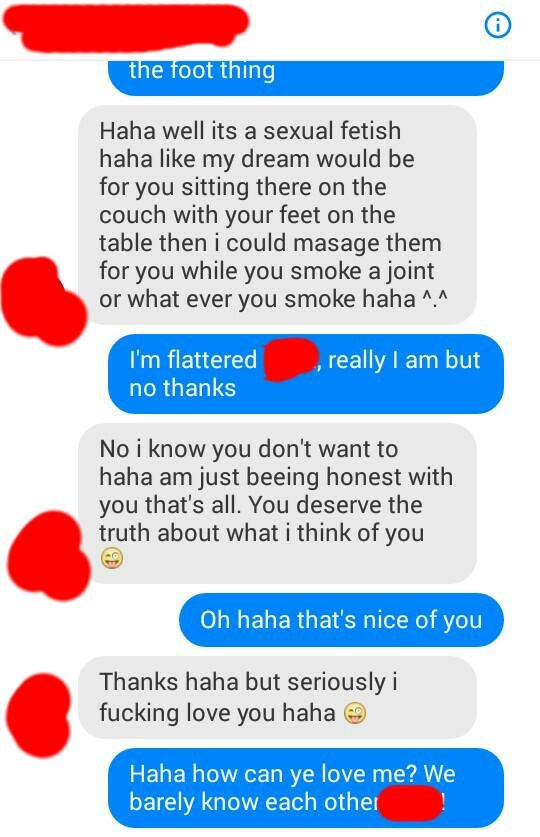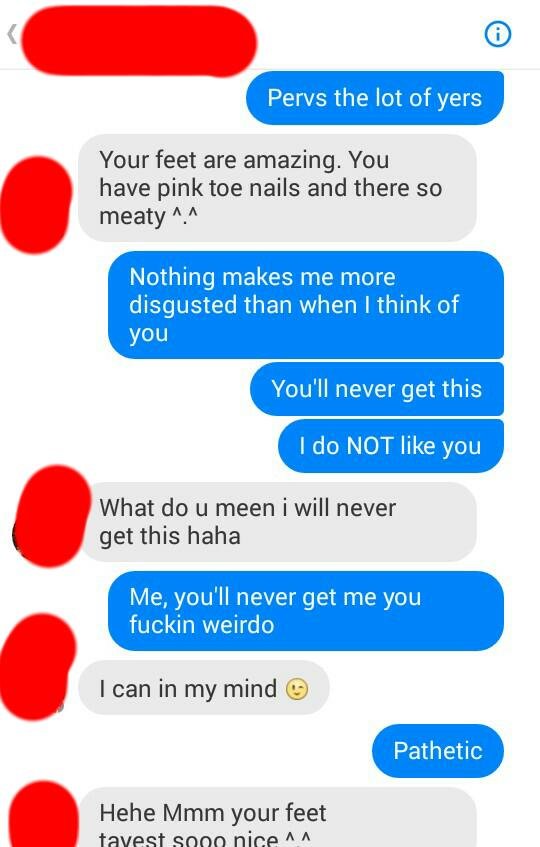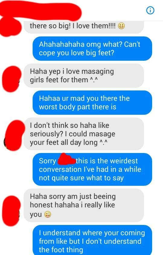 I don't get the whole foot fetish thing, but I guess everybody has their thing. I mean, if that's your thing, fine, but don't go saying all kinds of crazy **** to people like that. Especially when you barely know them, or if you don't know them at all. It's like people like this have been locked in a basement their whole life and don't know how to act around other people. Seriously, have some kind of a damn filter. At least if you want the other person to like you, or at the very least, if you want them to keep talking to you. Otherwise, you just creep them out and/or really piss them off. You can't just say whatever the hell pops into your head as soon as it pops into your head. What the hell is wrong with people?