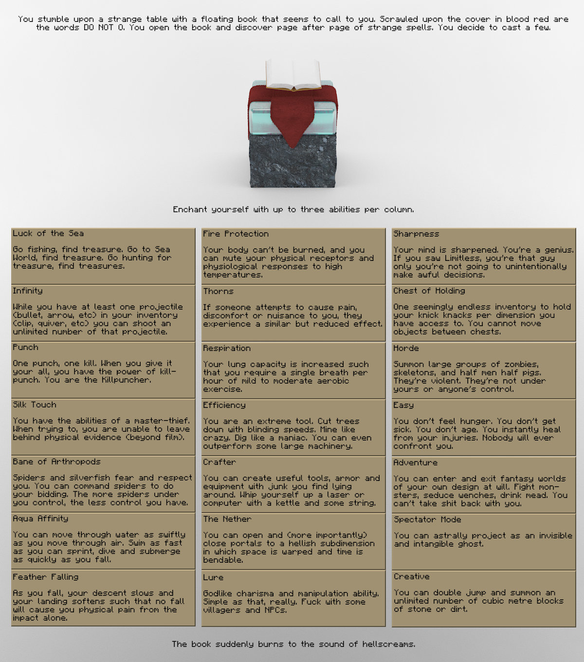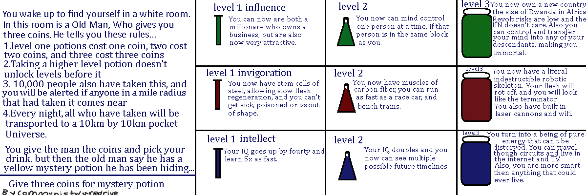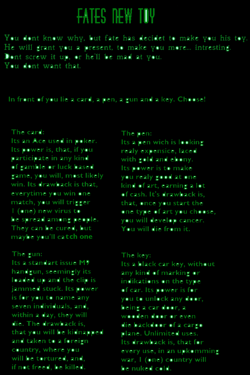 **georgefancy used "*roll picture*"** **georgefancy rolled image** yo im loving these. But i remember theres one CYOA where its about some dark god giving you and a bunch of other people non-op powers and special items. If you could somehow find and post that id love you forever.