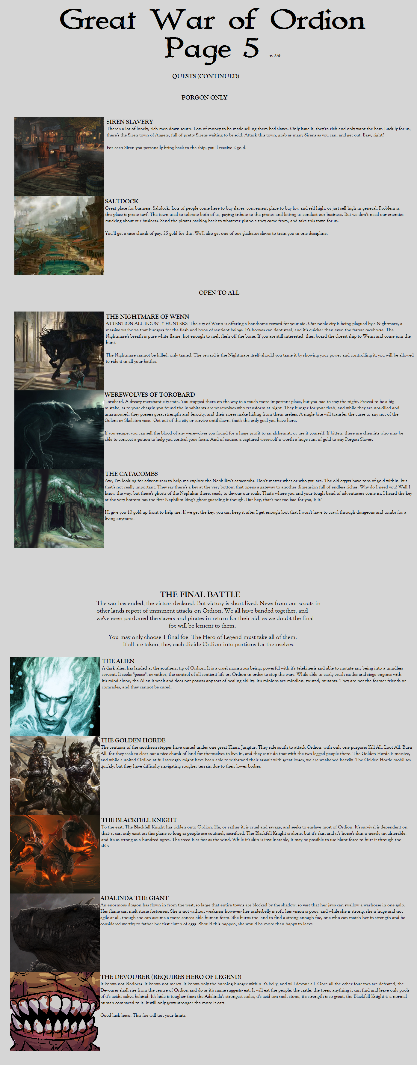 So yeah, last time you wanted use to critize your cyoa but I thought it was fine this one is probably the worst of the two. The Neutral Quests all seem thankless and have little rewards in comparison to the Faction Quests. I'd like to an actual form of Necromancy Disciple for our Selves. Definitely more Mage Companions, and at least two Neutral pure Healers or One per Faction. Wanted is pretty useless when Most Rogues would opt for the Blood Pirates or the Porgons. I'd say Half-breeds should be simplified, Add both of the races up and divide it by 2, then every two half point can be added anywhere, any extra half points are rounded down and go no where.