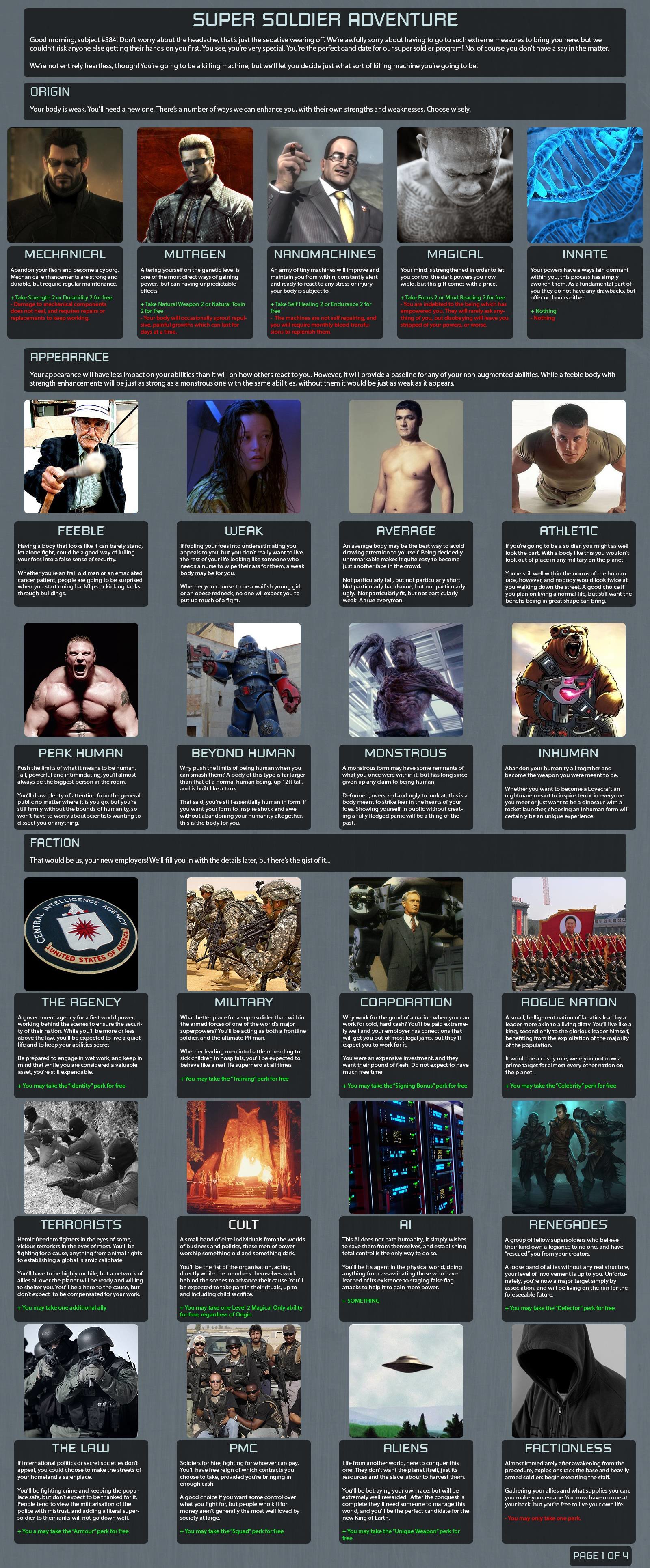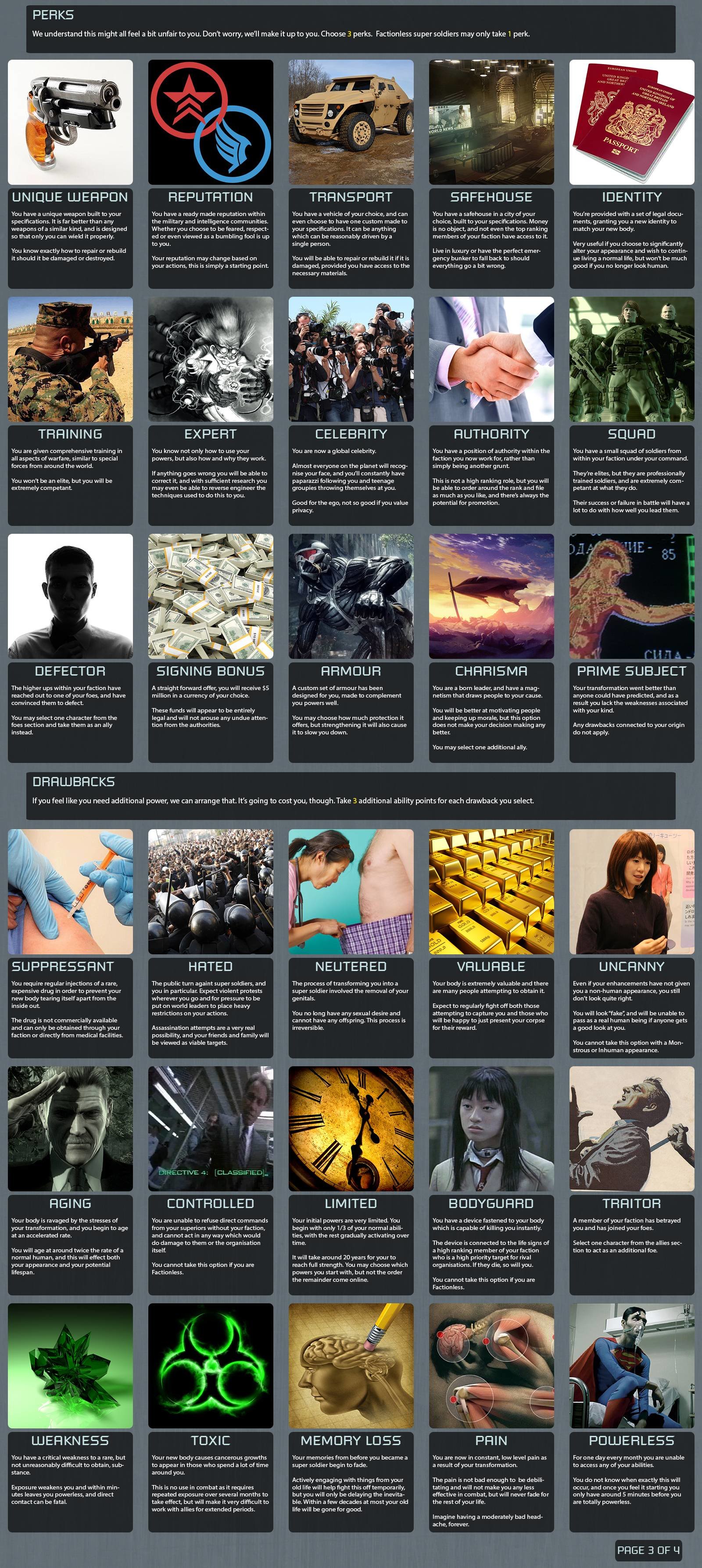 Perks - Squad (from faction), Training (this plus Unarmed 3 + strength 3 makes me near enough undefeatable in combat), Safehouse (Somewhere to stay when powerless), Signing Bonus (money to let me live in safehouse until all my abilities come through (due to limited)), Expert (foe 1)(I like understanding stuff, If I can begin to understand how and why they work I can maybe help others get them), Transport (foe 2)(Bad as Car/Plane hybrid, need I say more)