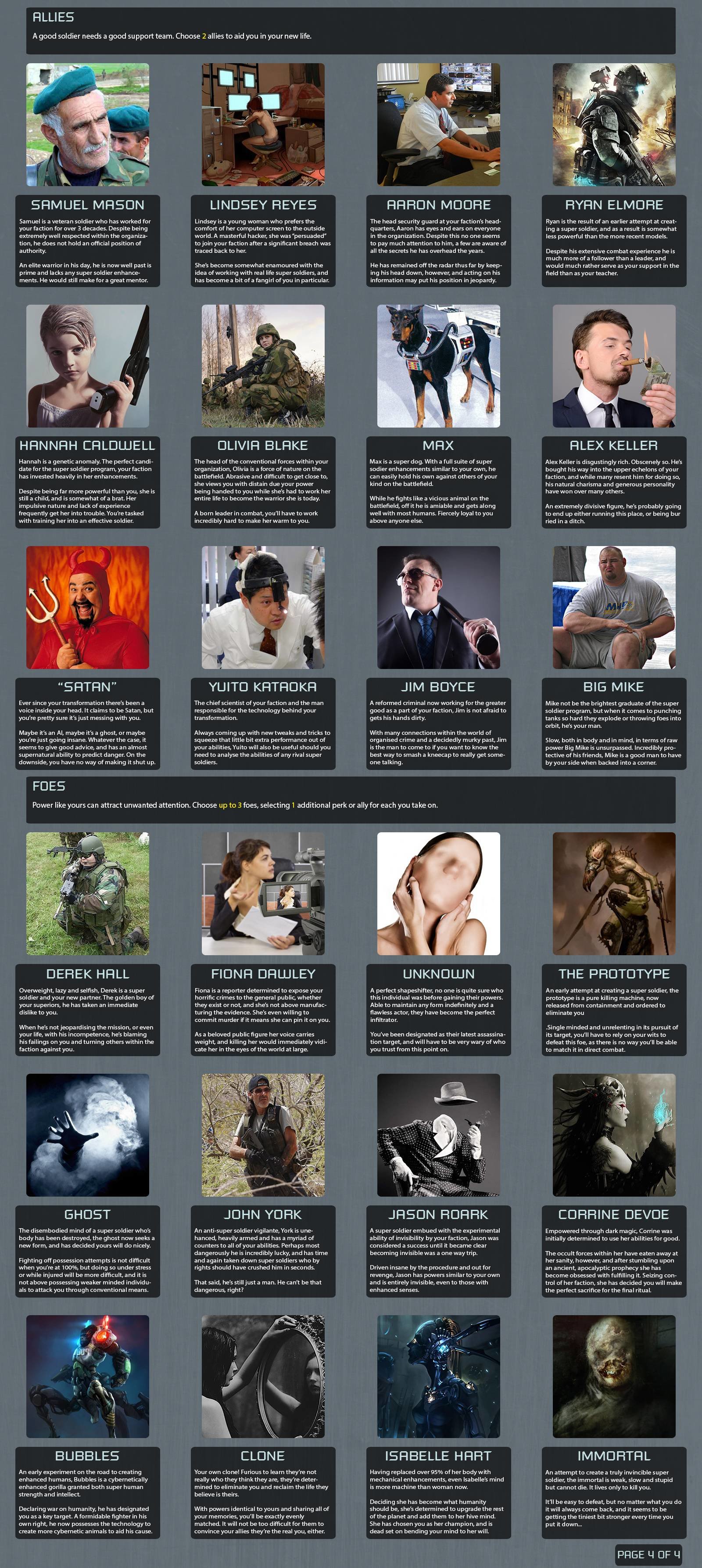 Allies: Lindsey Reyes, Yuito Kataoka, Hannah Caldwell, Ghost Ghost through the renegarde perk. Lindsey for electronic systems and yuito so that we someone who can create more super soldiers or optimize our abilities. Hannah as a long term bet. The ghost would be a rather flexible and strong weapon against our foes, prototype was a bit too simple since i expect my enemies to find a way to deal with him and the unknown might more likely get caught. The ghost can just posses enemies and escape the body when needed.