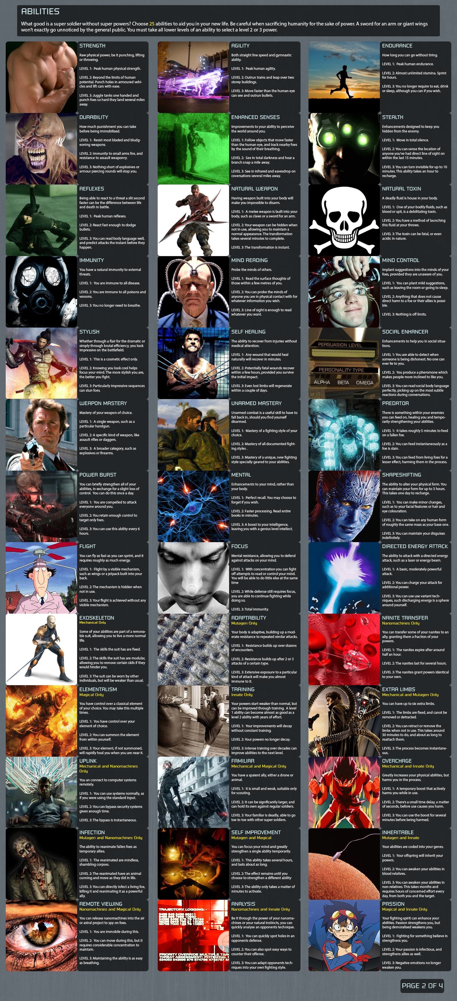 Endurance: Level 2 Peak human endurance and constitution, nigh-unlimited stamina