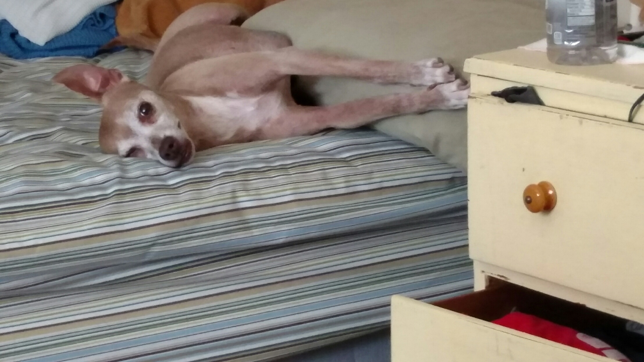 Here's my derp dog. Got her at a pound and I think she's a chihuahua/Italian greyhound mutt or something. She likes trembling, snuggling, and running fast.
