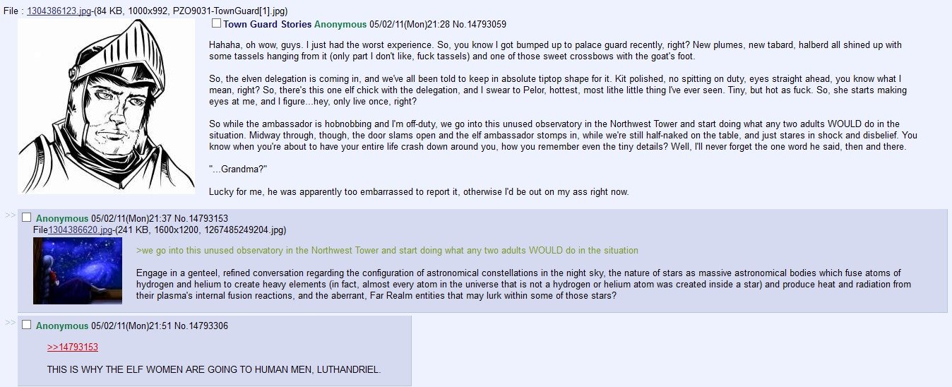 So, the elven delegation is coming in, and we' all been told to keep in absolute tiptop shape fer it. Kit polished, no spitting on duty, eyes straight ahead, you know what I