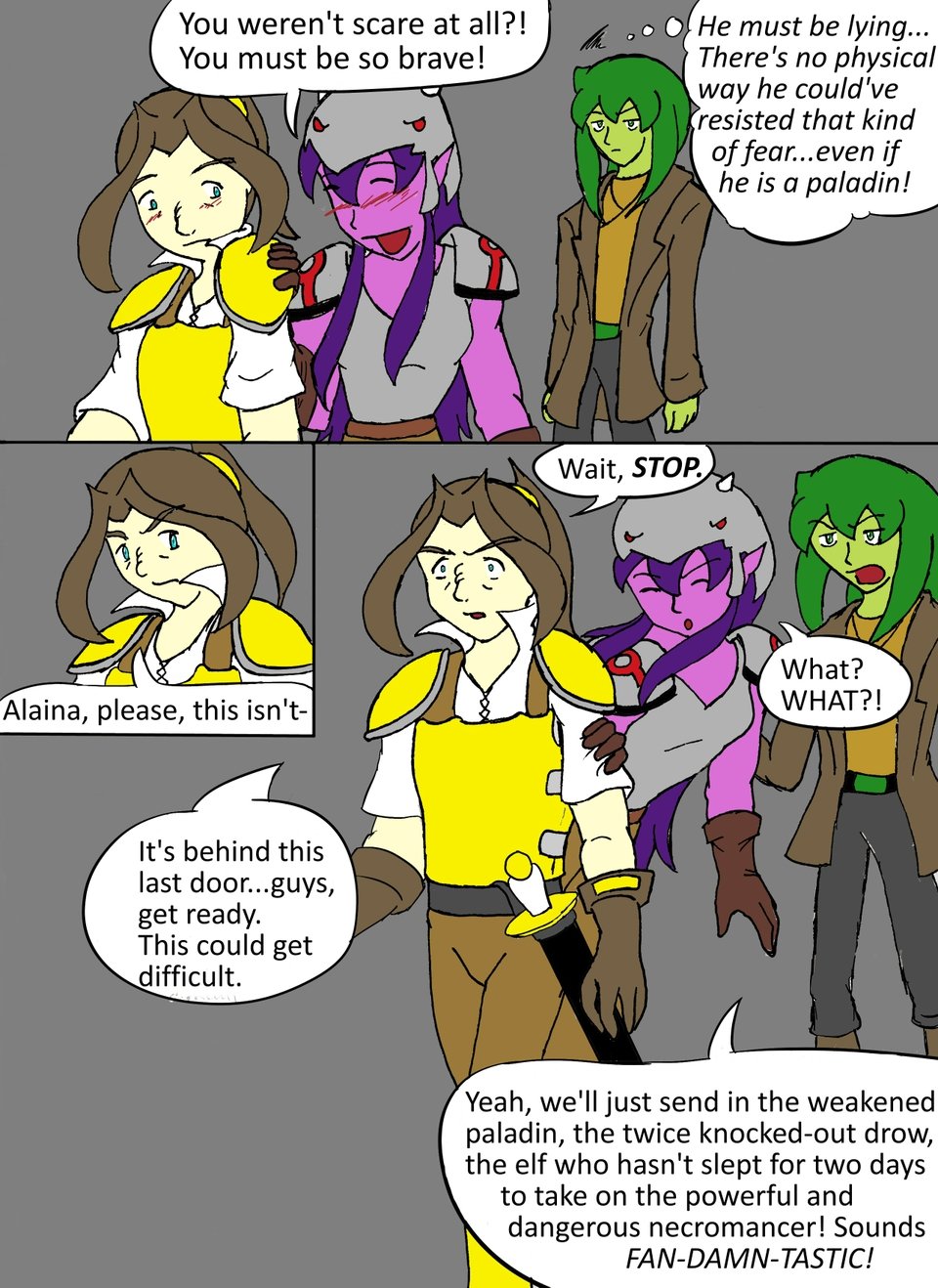 Thing to note. Back when we first made these characters and wrote this script we had ONLY played 2nd edition Advanced Dungeons and Dragons. Paladins didn't get a fear immunity until 3rd edition D&D, so Kilt's fearlessness is actually something of an odditty. Also, if you couldn't tell we're not following all of the rules of D&D strictly, we're just using them as a basis.