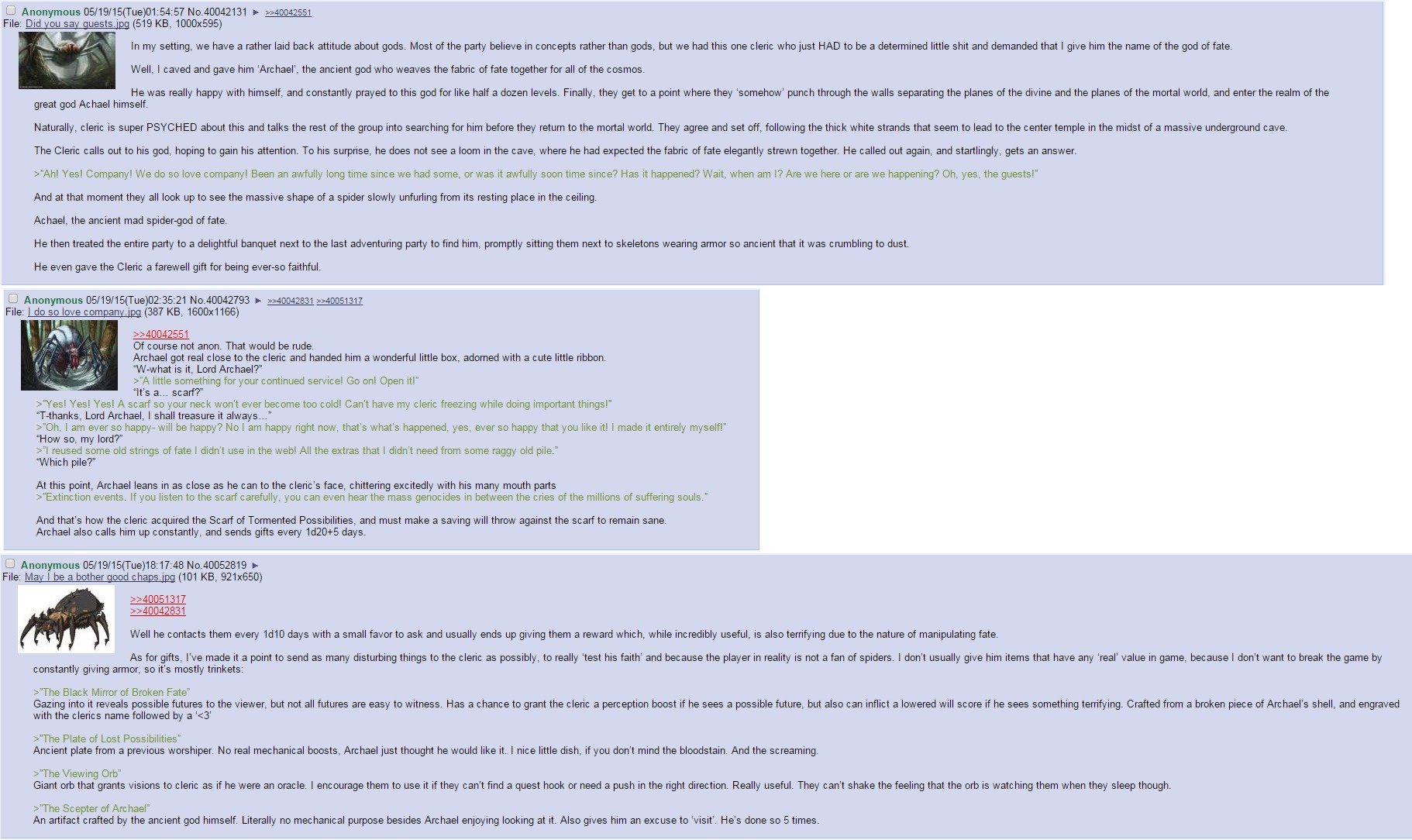 As for gifts, I' made it a paint to send as many disturbing things to the cleric as possibly, to really 'test his faith' and because the player in reality is not a fan of spiders. I don' t usually give him items that have any 'real' value in game, because I don' t want to break the game by