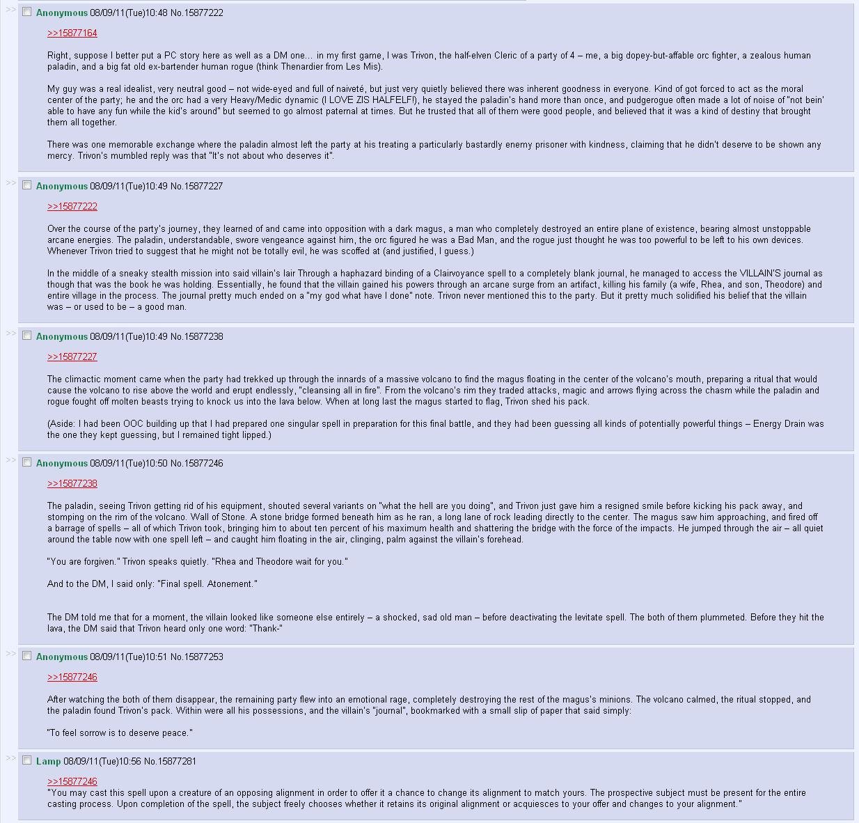 There was ens memerable exchange where the paladin almost left the party at his treating a particularly bastardly enemy prisonerzero kindness, claiming that he didn' t deserve to be shown any
