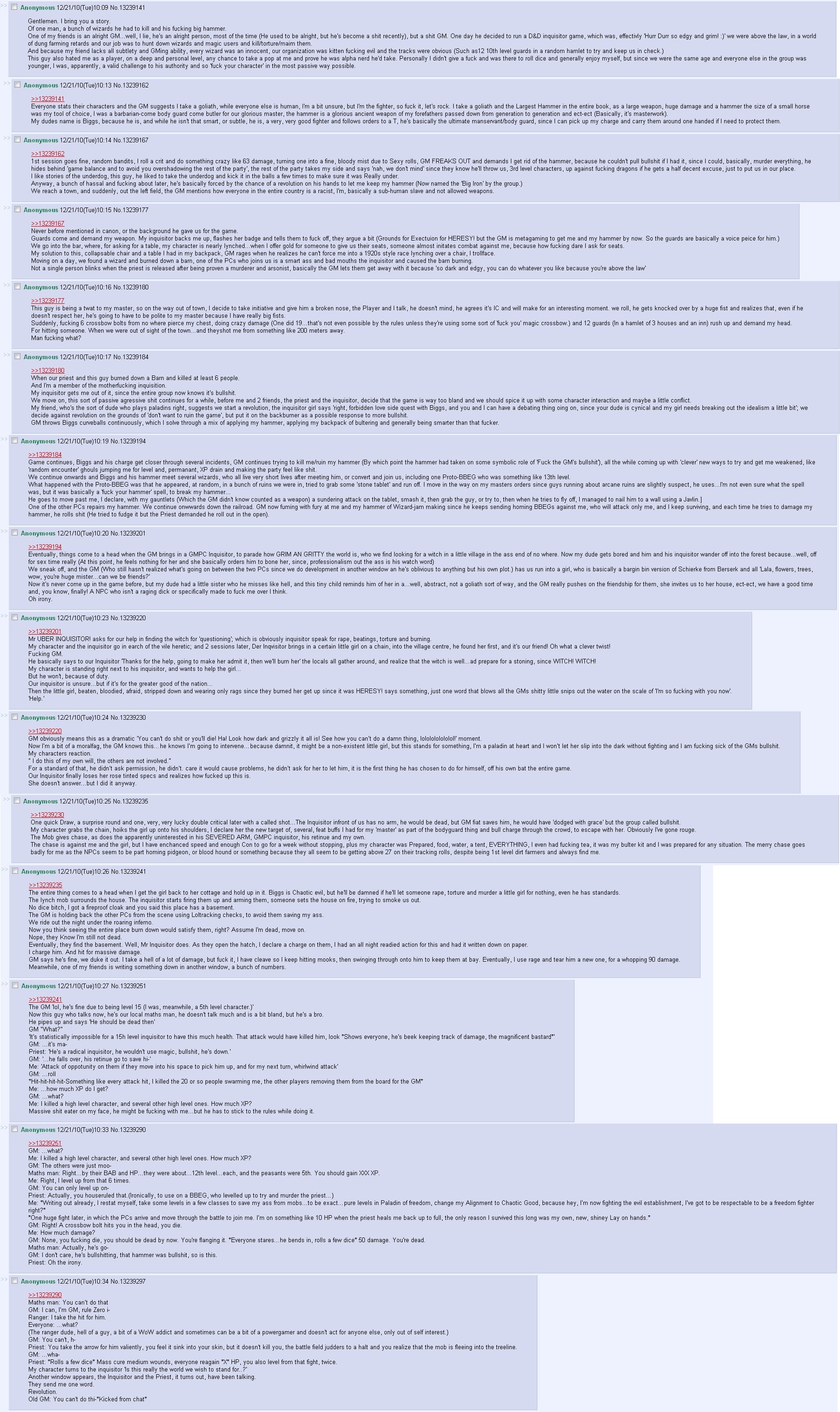 Oh, and he also decided that objects in town would have wildly differing prices based on quality, without telling us. I assumed it was some scummy merchant trying to scam money out of me (because ******* over our characters seemed to be a theme for this DM). He didn't communicate this at all.