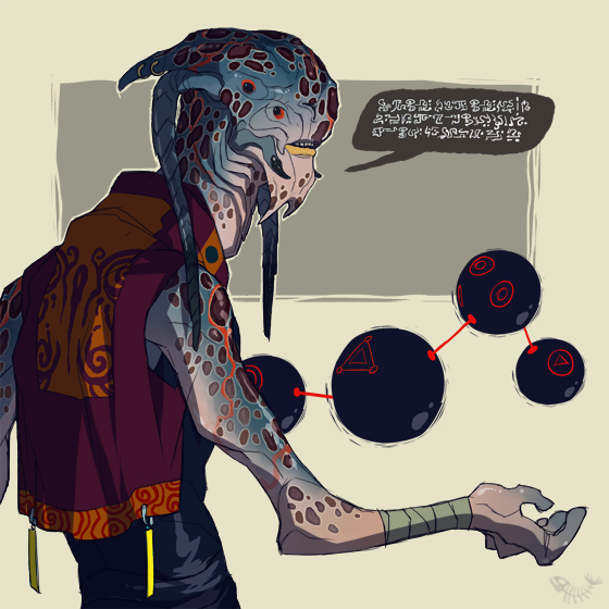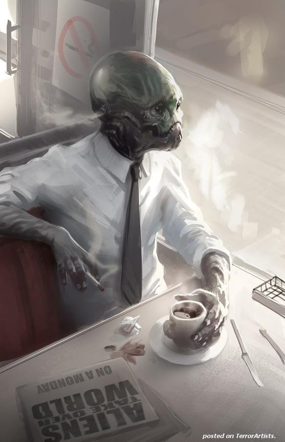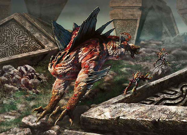 The Eldrazi aren't exactly aliens. They are far far worse. Generally when Imagining aliens, people think of something strange sentient beings from another planet in our universe. Eldrazi are from outside the universe. They go from universe to universe, devouring them until nothing is left, then move on to the next one. While a few of them appear to be humanoid, they still tend to have very inhuman features. One of the usual variations is the scond arm branching off at the elbows.