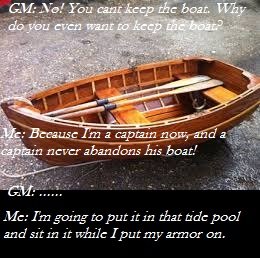 I argued for a bit and with some help was able to keep the boat... for about 5 minute in game time, at which point I had to leave it behind and it got burned by our cleric. For no reason.