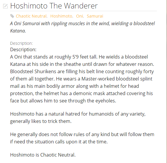 The Samurai offers a great defensive role while still allowing you to inflict decent blows, the key role of the Samurai is survival while it offers a lawful good roleplay agenda. The Samurai requires you to be honorable towards your lord or leader and breaking your vows or doing something that would blacken your honor causes you to become an Ex-Samurai under your Lords declaration. A Samurai without a Lord cannot take advantage of his Bushido abilities including all of their bonuses and cannot execute his Last Stand ability.