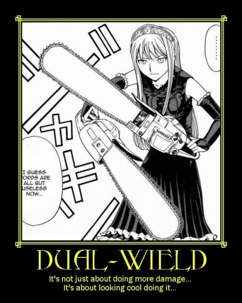 Here's a picture of Bayonetta quad-wielding Salamandra (her chainsaw's name). A little fun fact, Bayonetta propels herself with the Salamandra on her feet.