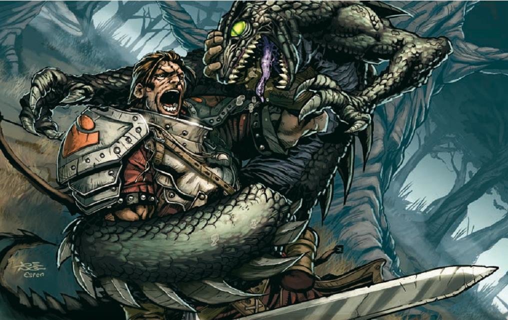 Tatzlwyrm - Yellow eyes flicker from the underbrush. In an instant a large reptile leaps out; six feet in length, a dragons head with daggered teeth and 2 powerful arms with razor claws. A cloud of noxious vapor escapes from its gory maw.