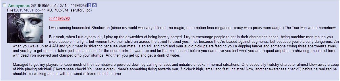 But yeah, when I run cyberpunk, I play up the downsides of being heavily barged_ I try to encourage people to get in their character' s heads; being machineporn makes you