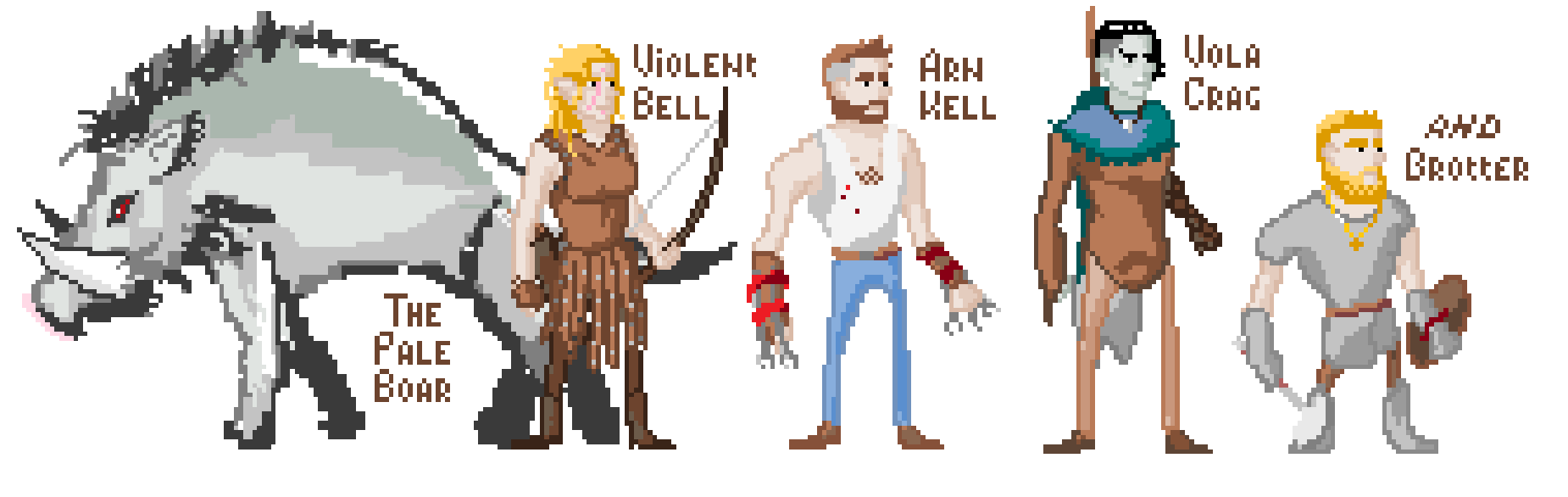 I'd love to see it, if not only for inspiration. These are the players (so far) in the campaign that I'm running, and I did it in Paint 'cos I'm too lazy to put something on paper. Left to right: half-elf ranger & animal companion, human fighter, half-orc barbarian and dwarf cleric.