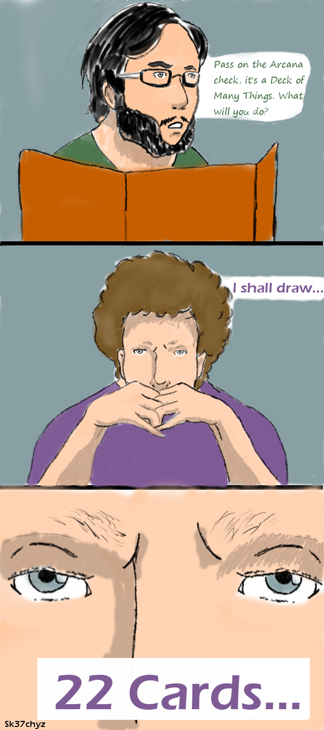 And in case you don't get the joke: Decks of Many Things only have 22 cards, and about five of them completely screw you over, one of them super badly. So yeah, drawing all 22 is suicidal.