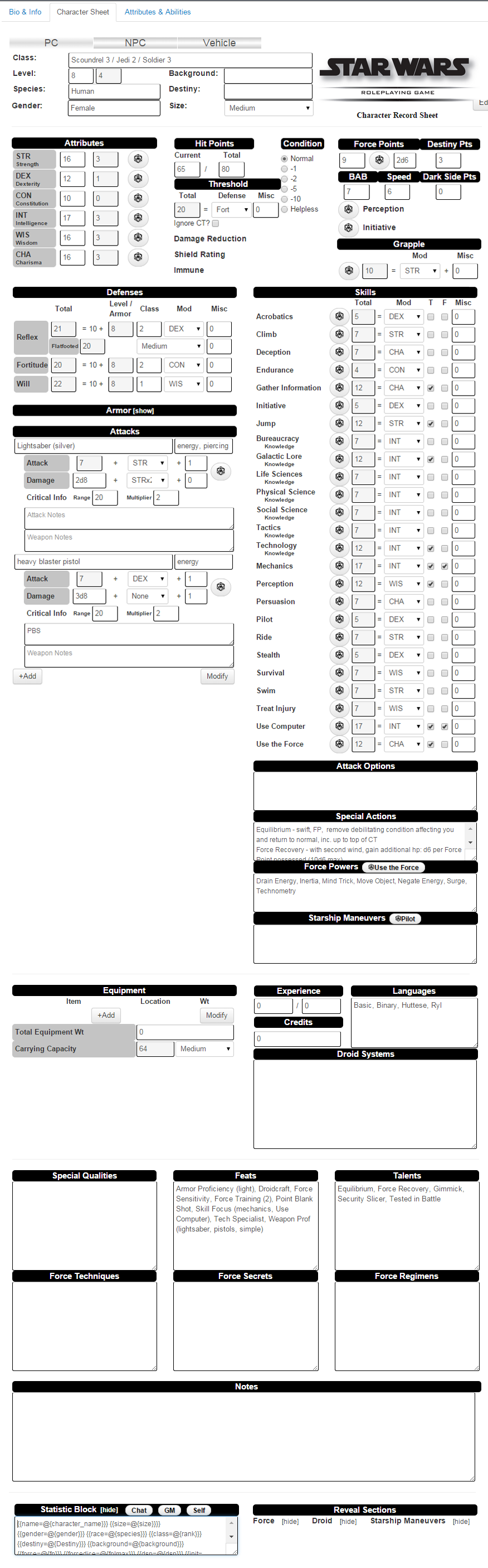 Class: scoundrel 3/ Jedi 2/ Solder 3