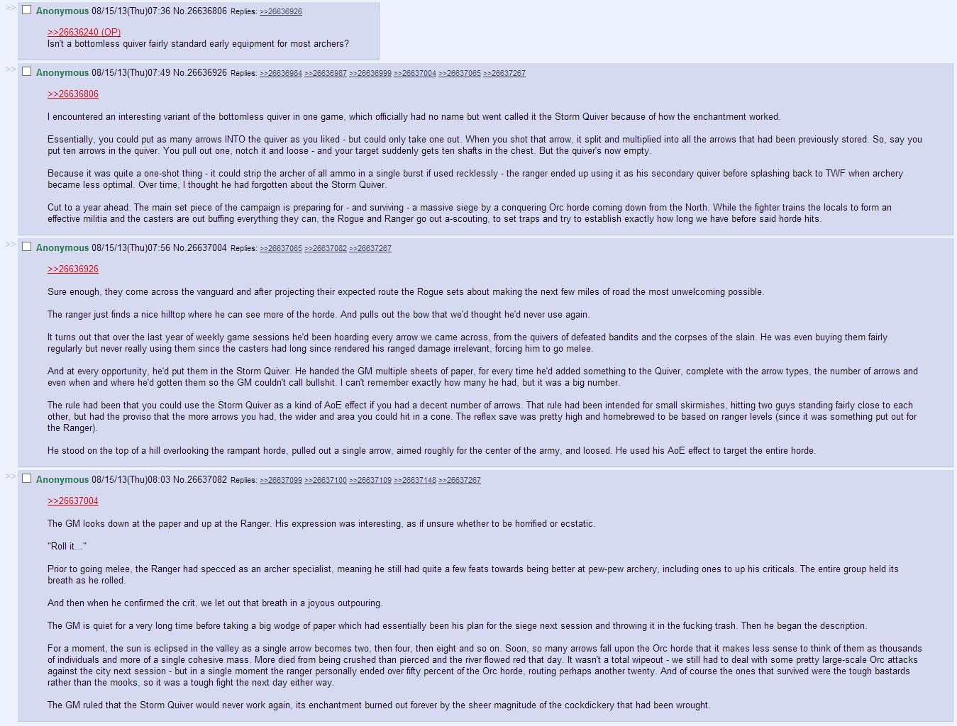 And at every opportunity, he' d punchem in the Storm Quiver. He handed the GM multiple sheets of paper, fer everytime he' d added something tithe Quiver, complete with the arrow types, the number of arrows and