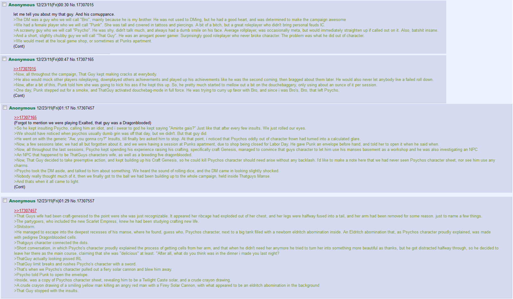 also would mock other players roleplaying, downplayed others achievements and played up his achievements like he was the secend coming, then bragged about them later. He would also never let anybody live a failed roll down.