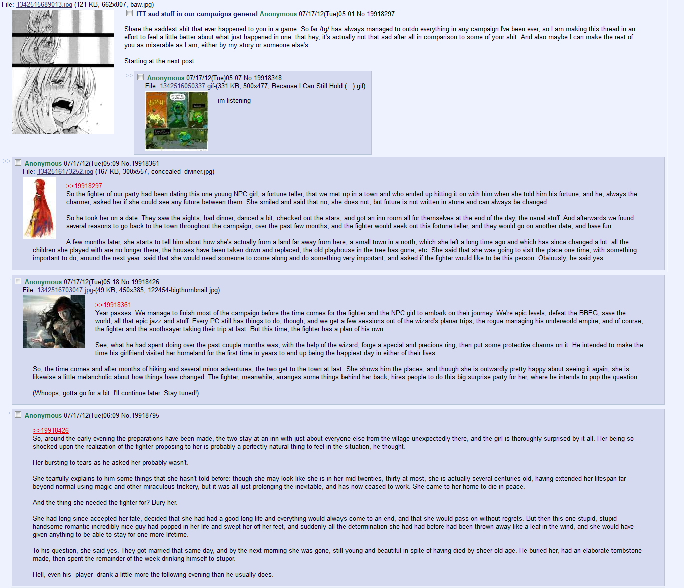 So the fighter of our party had been dating this one young NPC girl, a fortune teller, that we met up in a town and who ended up hitting it on with him when she told him his fortune, and he, always the