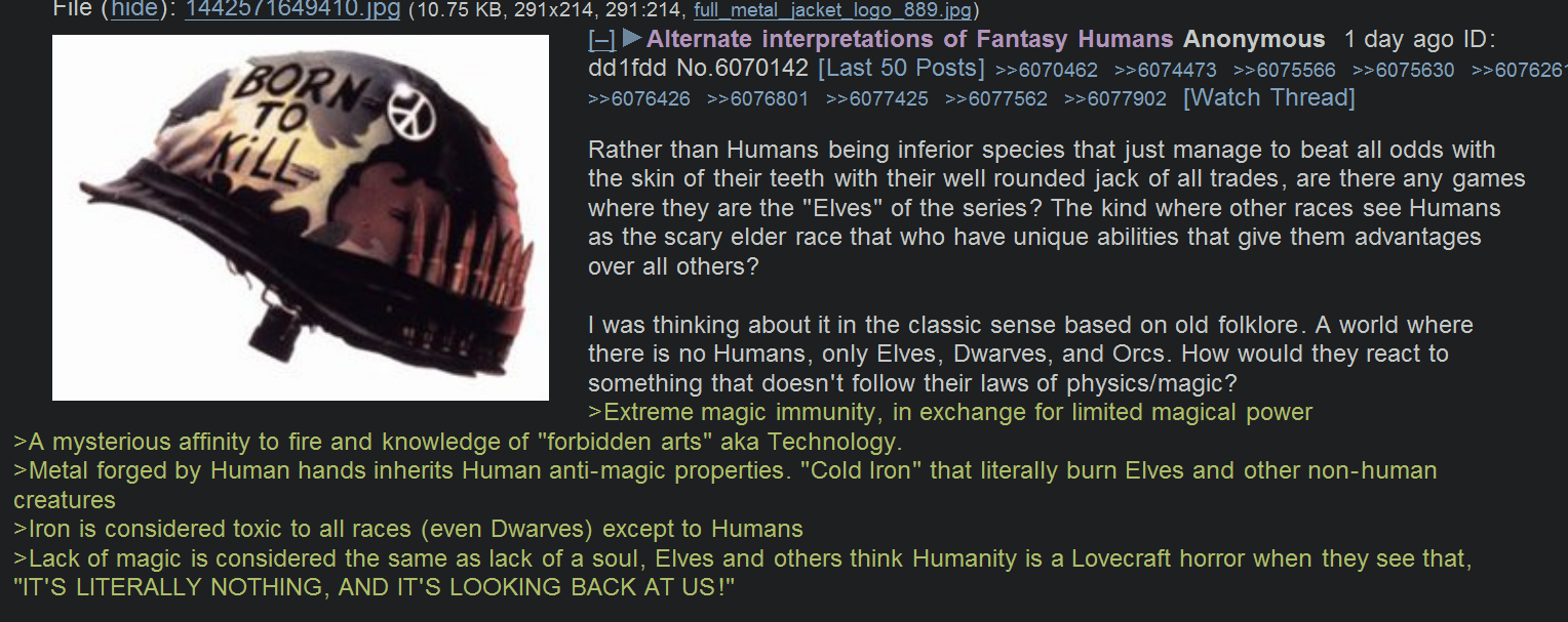 mack of magic is considered the same as lack of a soul, Elves and ethers think Humanity is a Lovecraft horror when they see that,